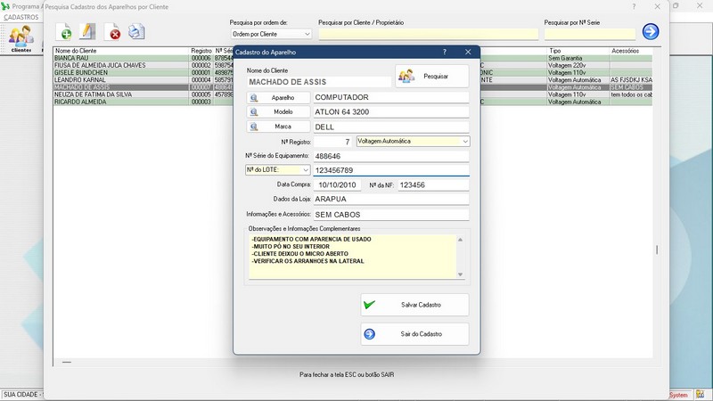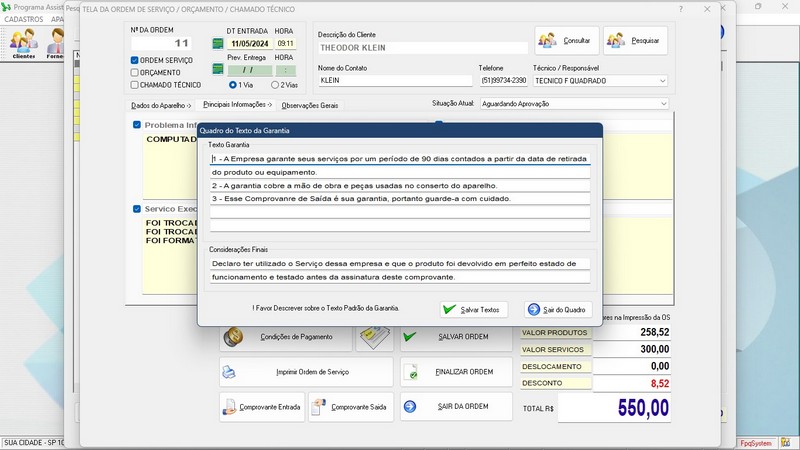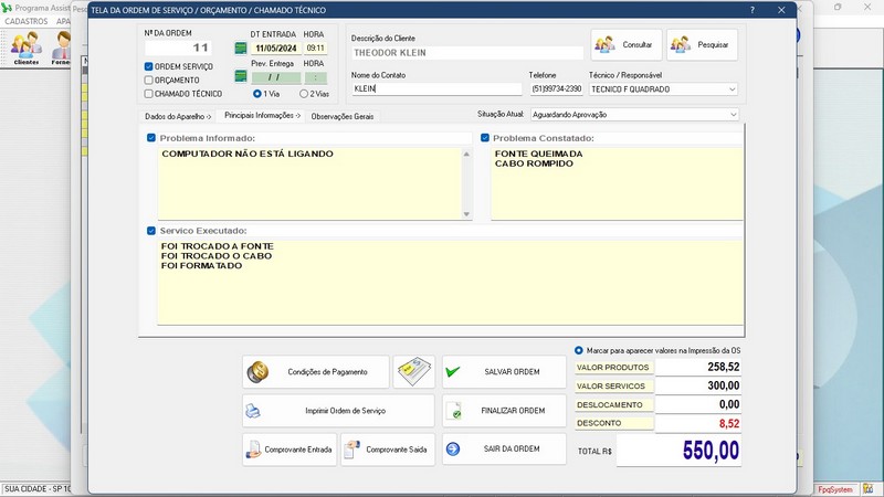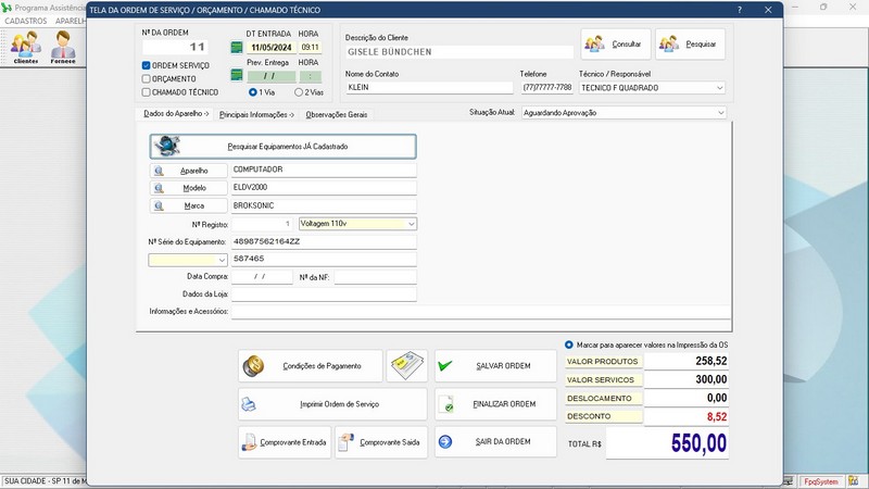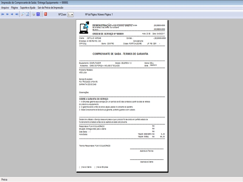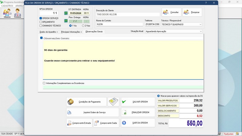 de Serviço / Orçamento / Clientes / Fornecedores / Técnicos / Relatório