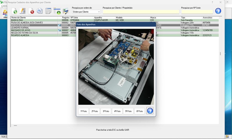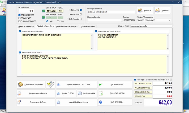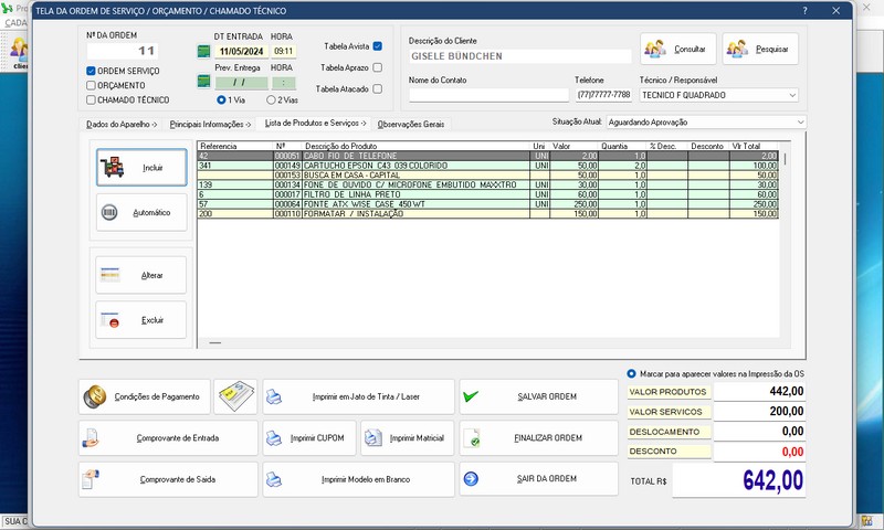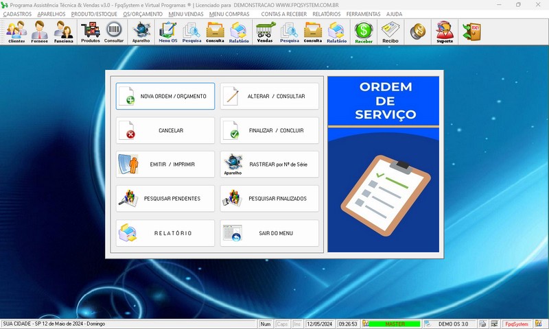 de Serviço / Orçamento / Clientes / Fornecedores / Técnicos / Relatório