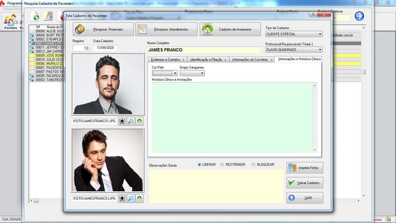 de Atendimento / Paciente / Anamnese / Profissional / Ficha de Paciente