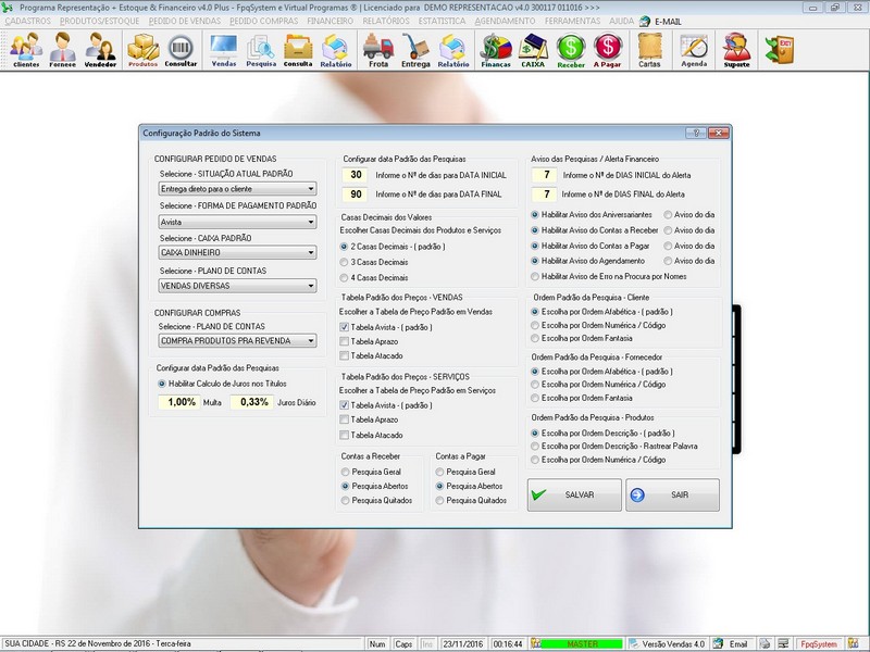Tela pra Configurar parametros de Venda