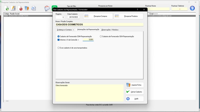 Orçamento / Clientes / Fornecedores / Representadas / Vendedores /