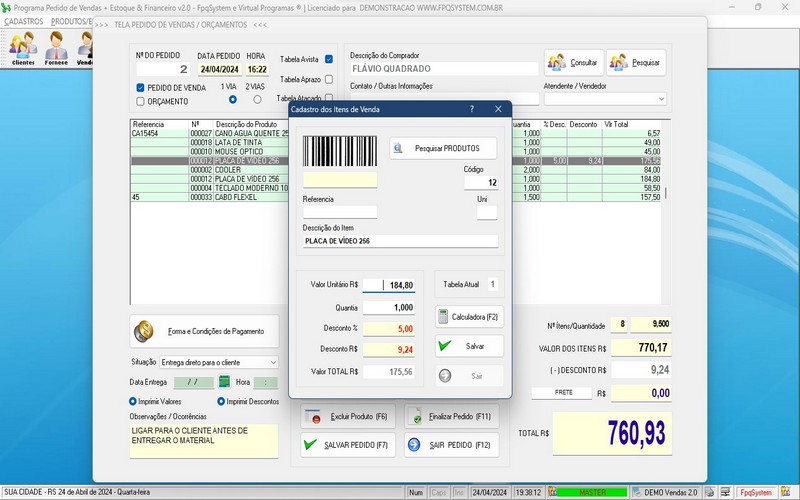 selecionando produtos, especificando quantidades, aplicando descontos,