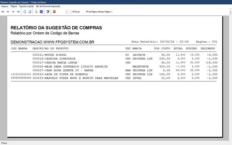incluindo detalhes como descrição, preço, quantidade em estoque minimo